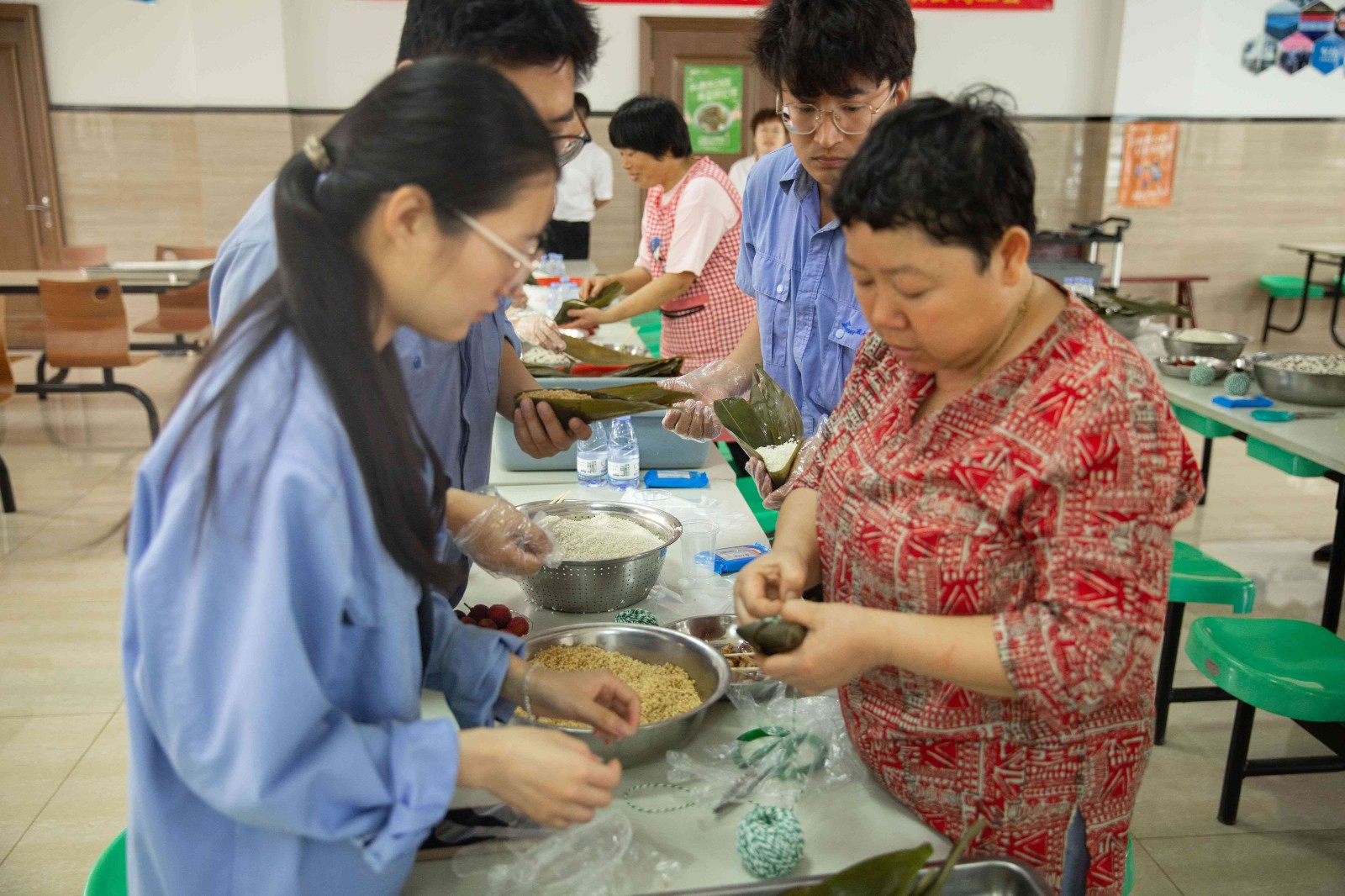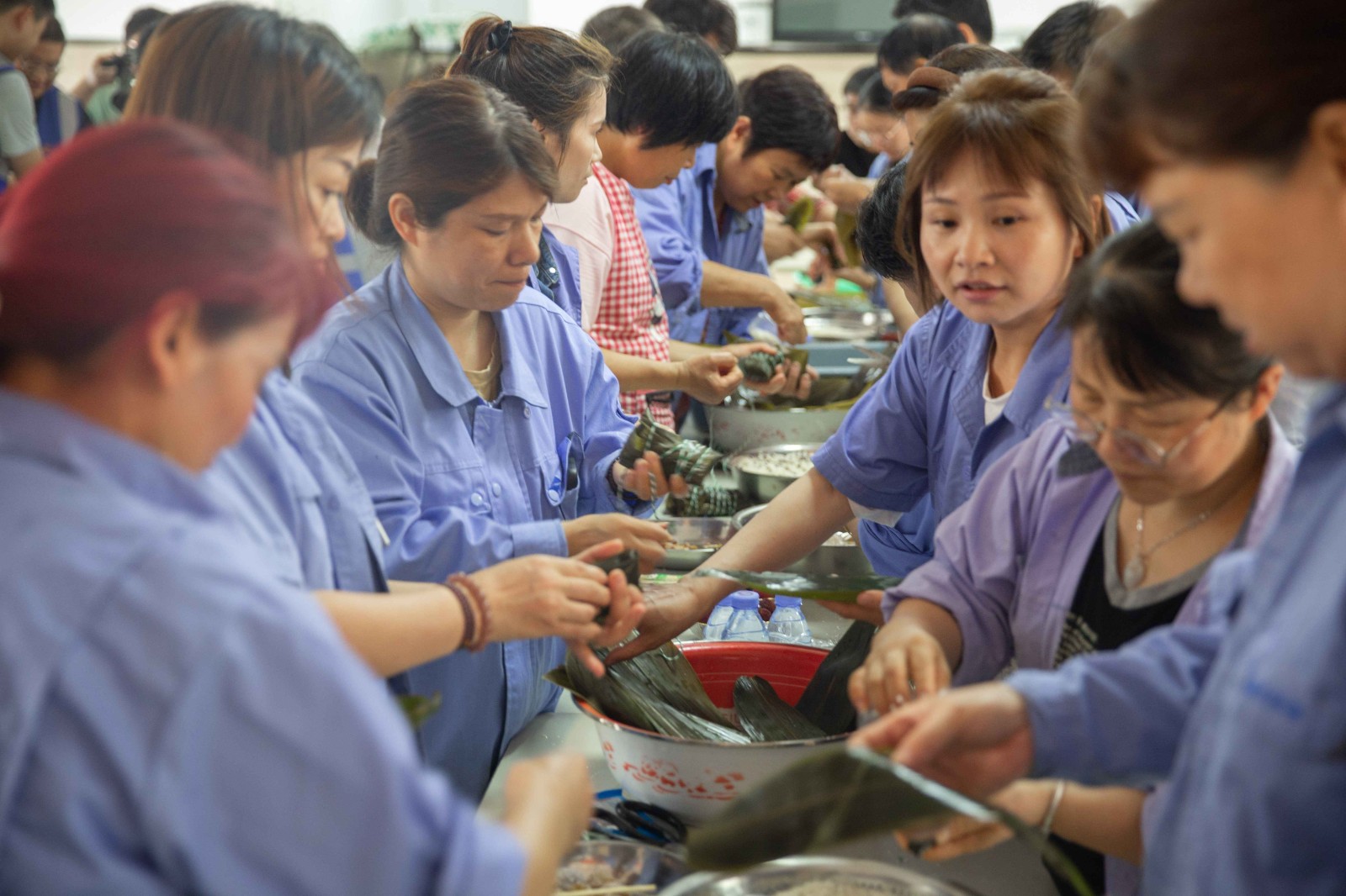 包粽子現(xiàn)場,職工們分工默契,熟練地捋粽葉、做漏斗狀、填糯米、壓緊實(shí)、封口、扎捆,一個個有模有樣的粽子迅速成型,現(xiàn)場被歡樂和諧的節(jié)日氣氛包圍,其樂融融。